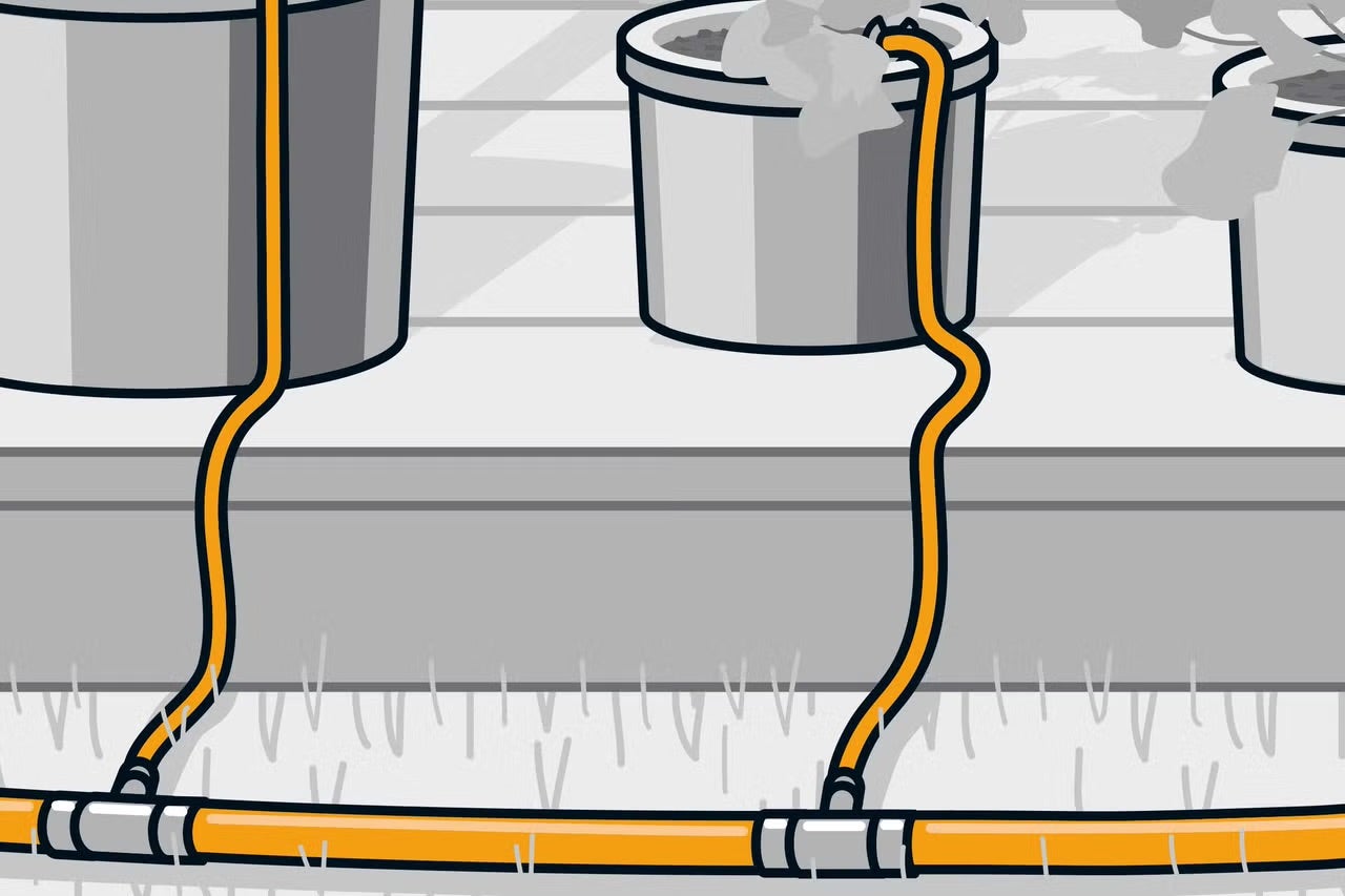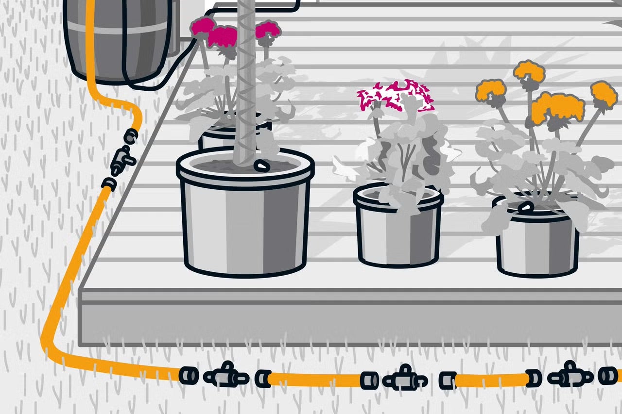Nainstalujte systém hadiček Micro-Drip od čerpadla v sudu k jednotlivým rostlinám v květináčích – před každým květináčem použijte T-kus. Alternativně můžete hadičku vést od rostliny k rostlině a u každé z nich použít jeden řadový kapkovač.