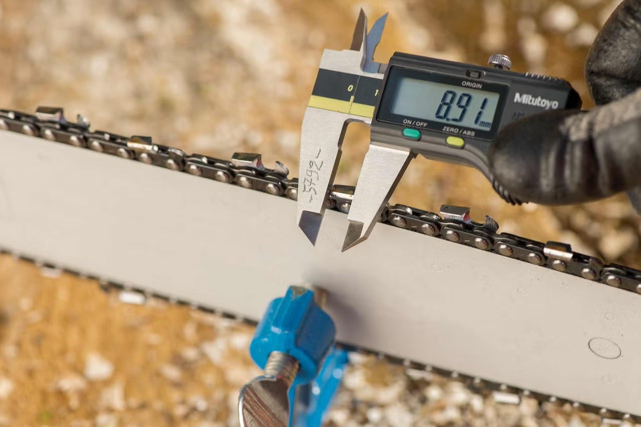 Nejprve pomocí posuvného měřítka (šuplery) zjistěte, který řezací zub vašeho řetězu je nejkratší. Tento zub naostřete kulatým pilníkem jako první a následně jej znovu změřte.