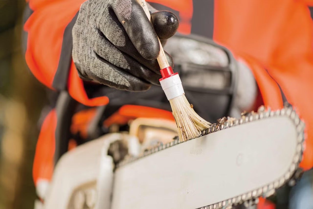 Před broušením byste měli řetěz zkontrolovat, zda není poškozený, což by v takovém případě vyžadovalo jeho okamžitou výměnu. Proto řetěz nejdřív očistěte od nečistot. K čištění řezné části se hodí čisticí prostředky na odstranění pryskyřice a také štětec. Nebo je můžete na noc namočit do benzínu.
