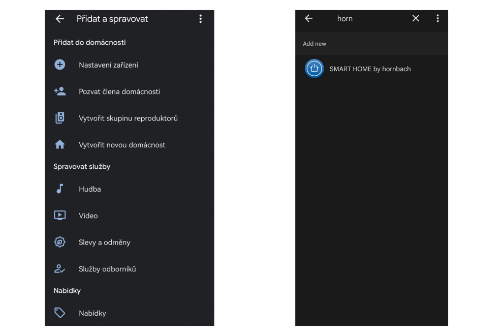 Nyní vyberte položku "Už jste nastavili zařízení? Zde uvidíte již propojené a nové služby. Nyní vyberte službu SMART HOME by hornbach v seznamu nebo prostřednictvím vyhledávání.