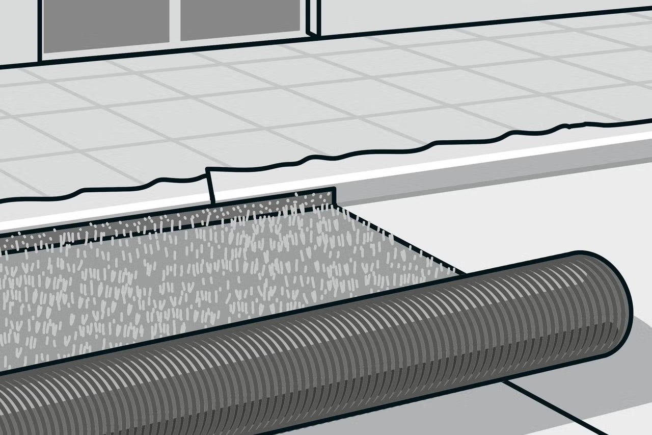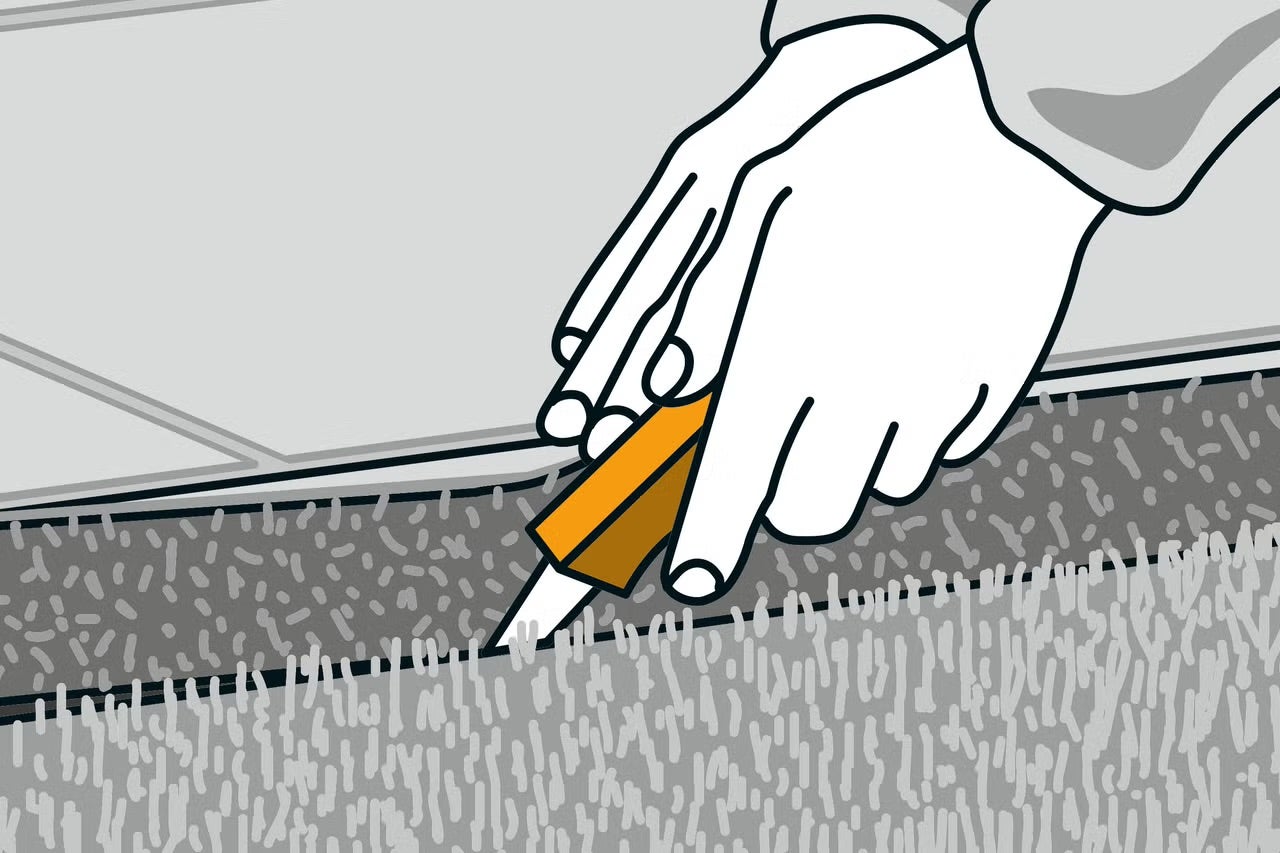 Jste s pokládkou spokojeni? Je vše umístěno správně? Lícuje to? Tak můžete odstřihnout přečnívající okraje po celém obvodu ostrým nožem na koberce.