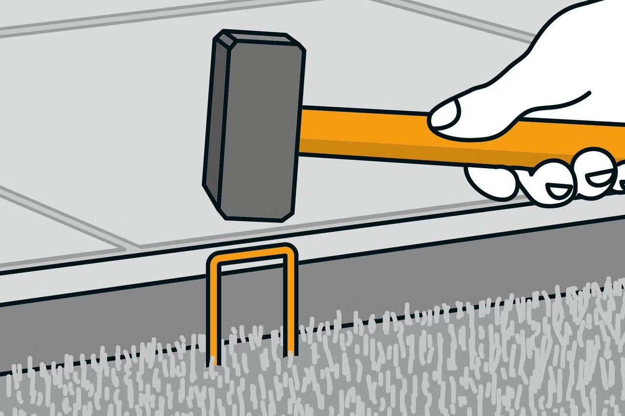 P o okrajích upevněte trávník do země pomocí kovových hřebů nebo skob – jeden kolík/skoba na metr.