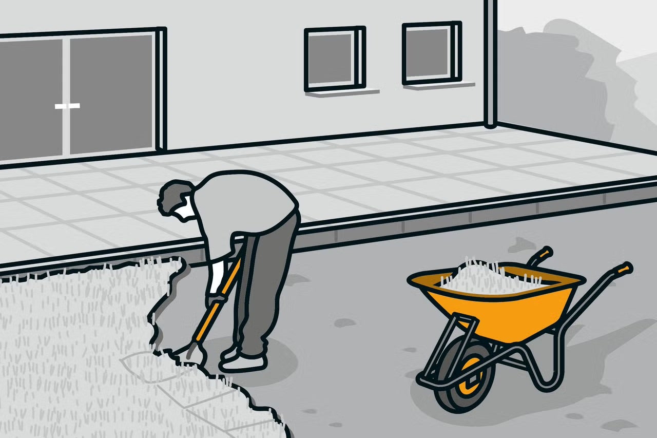 Než začnete s pokládkou, musíte připravit podklad: ten musí být rovný a pevný. Na plochu naneste 5 až 6 cm silnou vrstvu písku – tuto tloušťku nezapomeňte zohlednit při plánování konečné výšky trávníku.