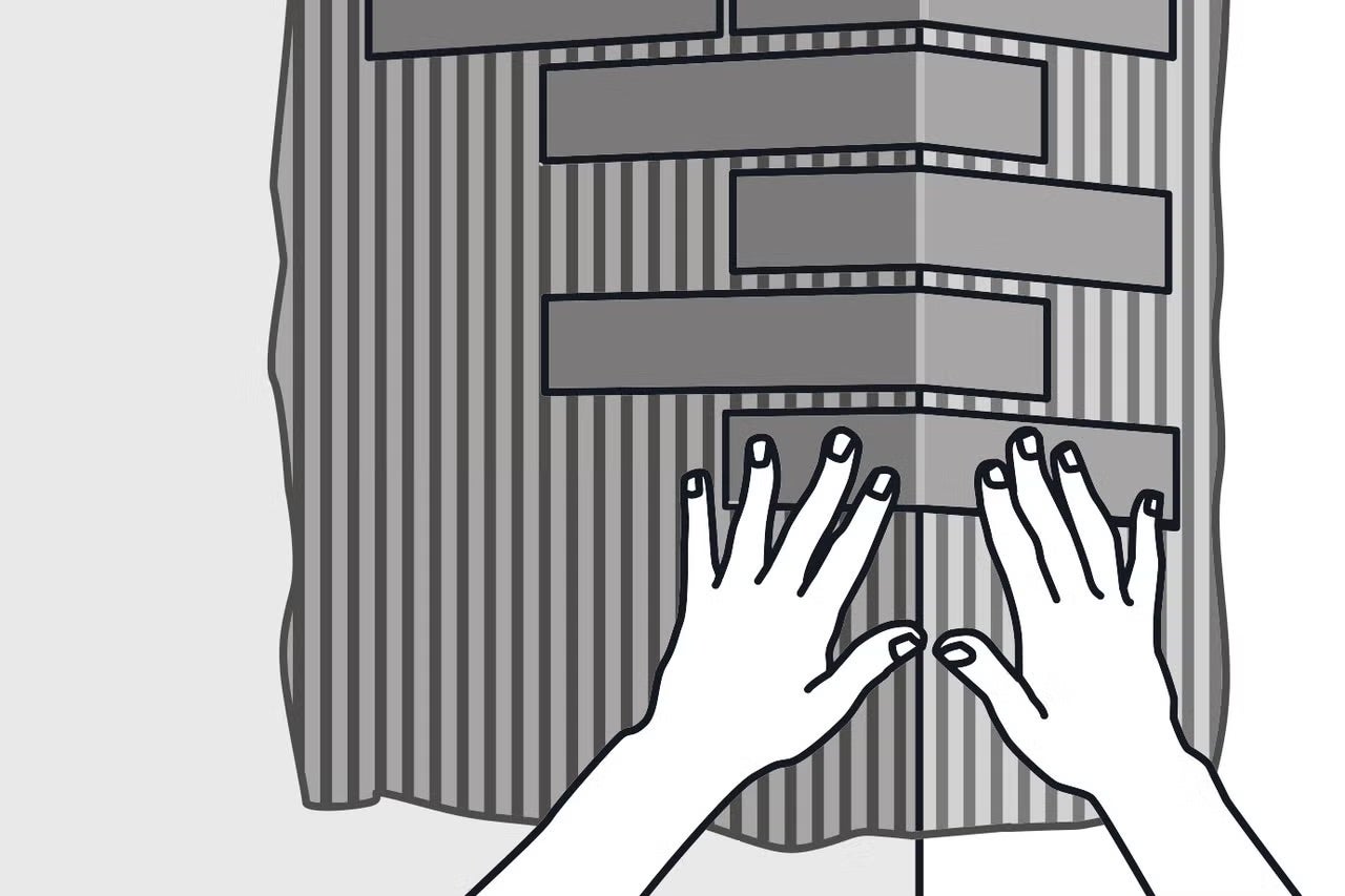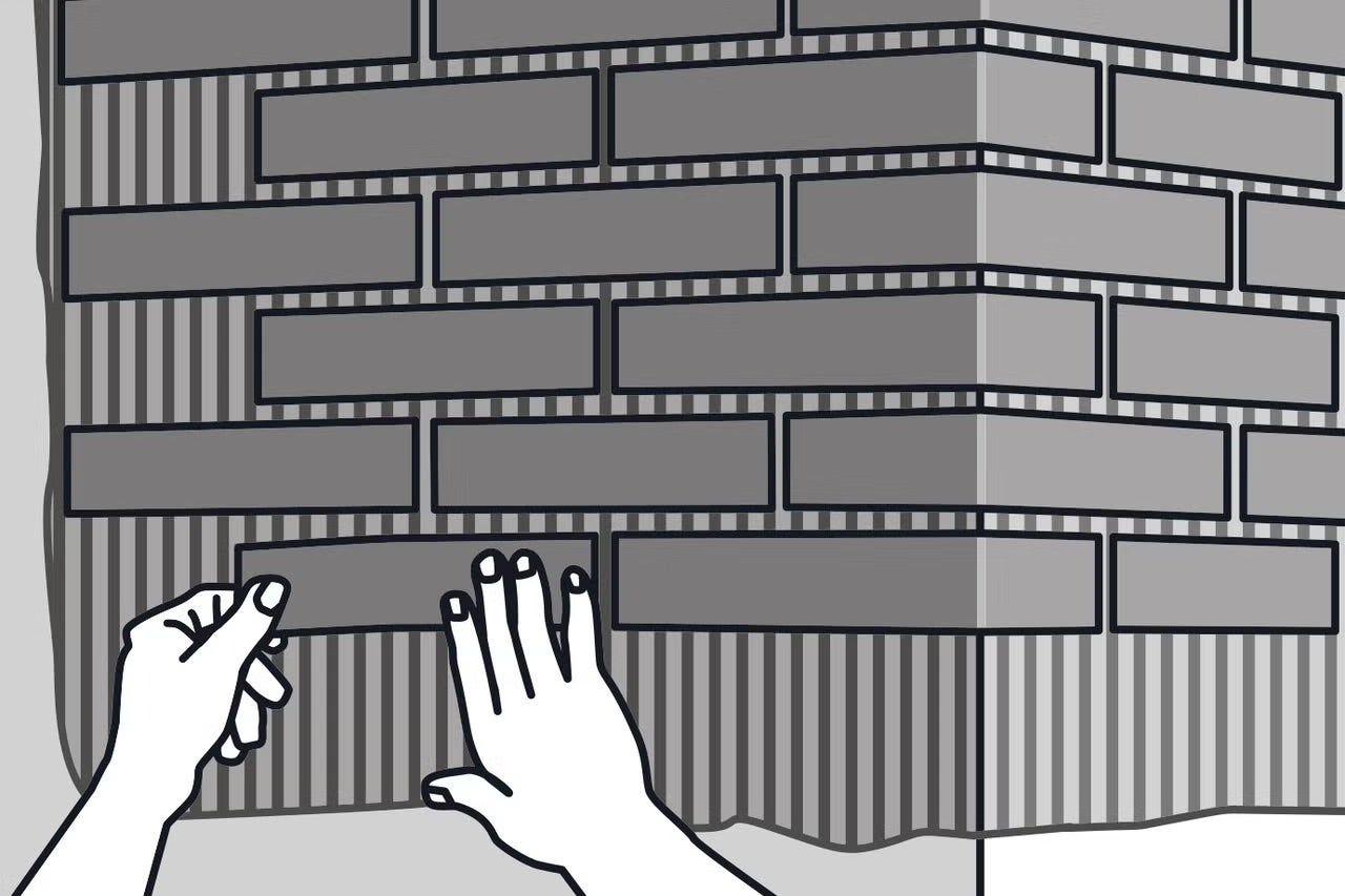 Cihlové obkladové pásky by měly být aplikovány shora dolů, aby nedošlo k tomu, že se zbytky lepicí malty dostanou na již použité obkladové pásky. Vyberte pevný výchozí bod, nejlépe horní roh okenního nebo dveřního rámu.