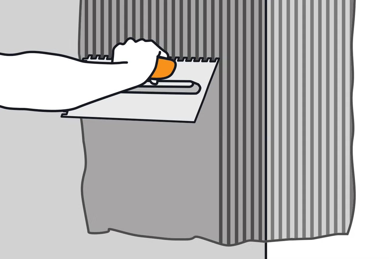 Lepicí maltu nanášejte pomocí zubatého hladítka shora dolů (rýhy by měly být orientovány svisle). Postupujte po menších plochách. Zubaté hladítko držte pod úhlem přibližně 30°. Pokud nanesená lepicí malta vyschne, navlhčete ji pomocí rozprašovače na rostliny (nastaveného na mlhu).