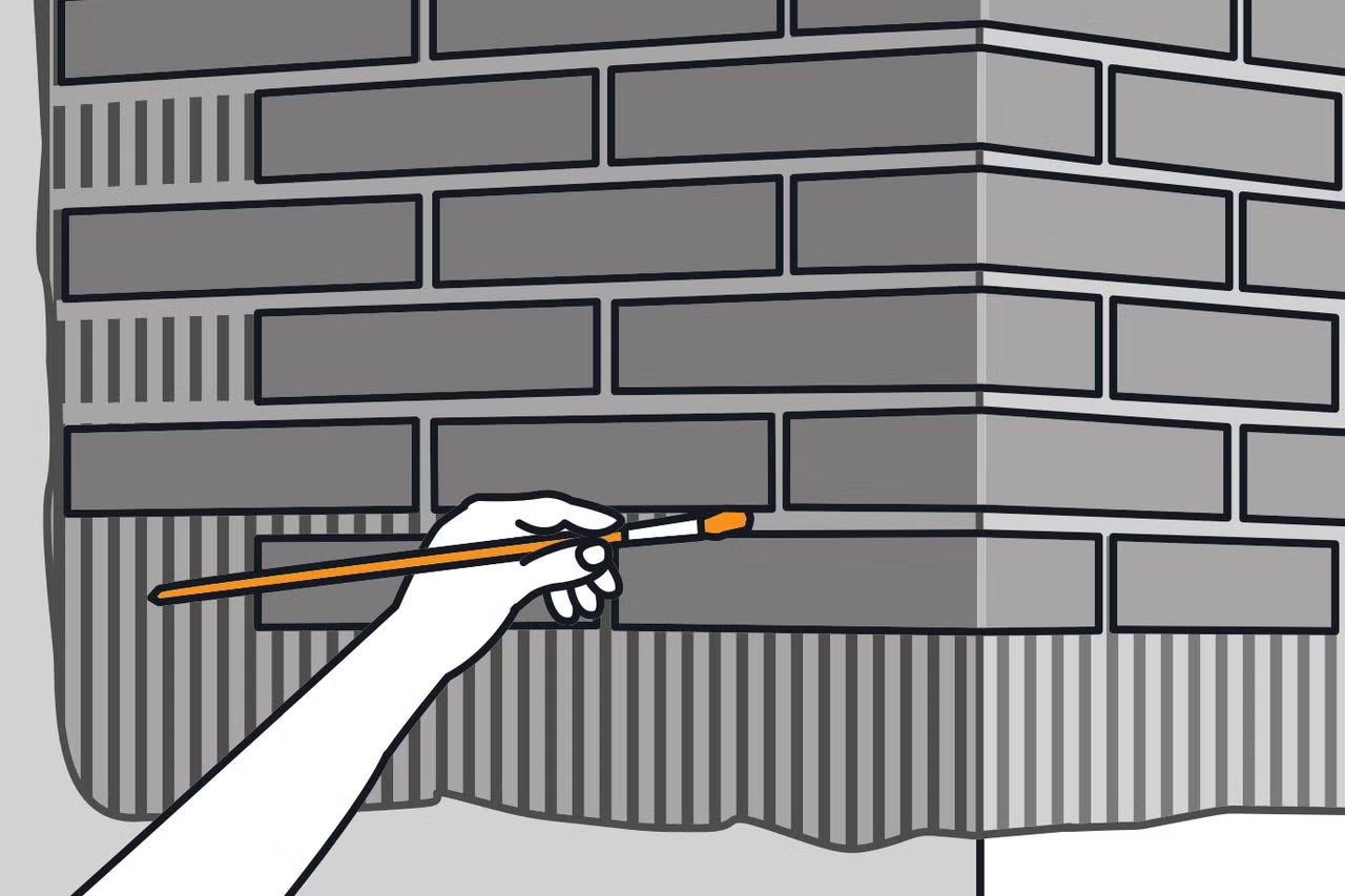 Štětec držte pod úhlem a uhlazujte spáru zespodu i shora tak, aby lepidlo rovnoměrně přiléhalo ke krajům cihlových pásků. Vlhkost se nesmí dostat za cihlový pásek. Otvory ani mezery nesmí být viditelné. Dlouhým souvislým pohybem nejprve uhlaďte svislé a poté vodorovné spoje.