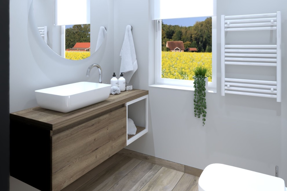 Kompletně vybavená koupelna Münsterland vytváří útulnou auru díky hnědým obkladům z porcelánové kameniny ve vzhledu dřeva. Skutečným lákadlem pro oči je ale dvojitá vana o rozměrech 180 x 80 cm. S ní ladí umyvadlo na desku s toaletní skříňkou v přírodním dubovém vzhledu. Celek završuje pohodlný a velký sprchový kout s rohovým vstupem. Co víc si můžete přát?