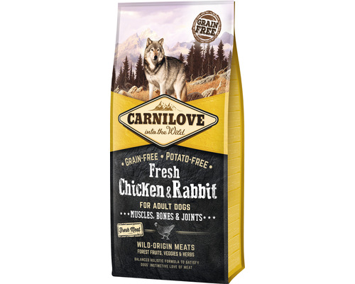 KRMIVO BEZ OBILOVIN A BEZ BRAMBOR S ČERSTVÝM MASEM PRO DOSPĚLÉ PSY. KOMPLETNÍ KRMIVO PRO PSY. Carnilove Fresh Kuře & Králík byl navržen s respektem k původní přirozenosti psů, tak aby jim poskytl vyváženou stravu bohatou na čerstvé maso v kombinaci s různými druhy zeleniny, ovoce a bylin. Návrat k přirozené stravě zlepšuje trávení psa a podporuje správný růst svalů a chrupavek. Extrakty z mušlí pomáhají udržet silné kosti a zdravé klouby.