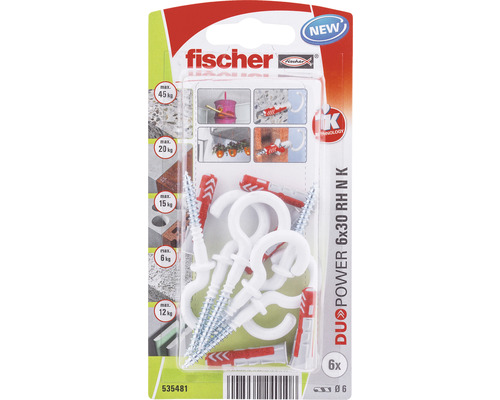 - Set se skládá z6x univerzální hmoždinka DUOPOWER 6x30, 6x kulatý bílý hák