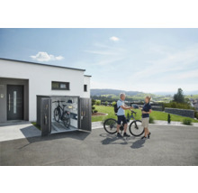 Do plechové garáže Biohort MiniGarage lze bez problémů uložit až 2 jízdní kola nebo zahradní stroje, nábytek apod. Kolejnice pro jízdní kolo (k dostání volitelně) usnadní jeho srovnání: Vjeďte předním kolem do vodicí kolejnice a zasouvejte kolo za sedátko směrem dozadu do té doby, dokud nebude přední kolo zasunuto v držáku, hotovo! Pro uložení dalšího cyklo příslušenství je ideální set regálů.