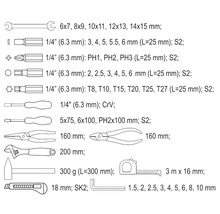 - Set se skládá zŠestihranné klíče 8x (1,5, 2, 2,5, 3, 4, 5, 6, 8, 10), Stranové klíče 5x (6x7, 8x9, 10x11, 12x13, 14x15mm), Bity ploché 5x (3, 4, 5, 5,5, 6 mm), Bity křížové 3x (PH1, PH2, PH3), Bity šestihran 6x (2, 2,5, 3, 4, 5, 6 mm), Bity torx 6x (T8, T10, T15, T20, T25, T27), Šroubovák na bity 1x, Šroubovák plochý 2x (5x75, 6x100mm), Šroubovák křížový 1x (PH2x100), Kleště 2x (kombinované, prodloužené), Klíč nastavitelný 1x (200 mm), Kladivo 1x (300 g, délka 300 mm), Svinovací metr 1x (3m), Vylamovací nůž 1x, Brašna 1x